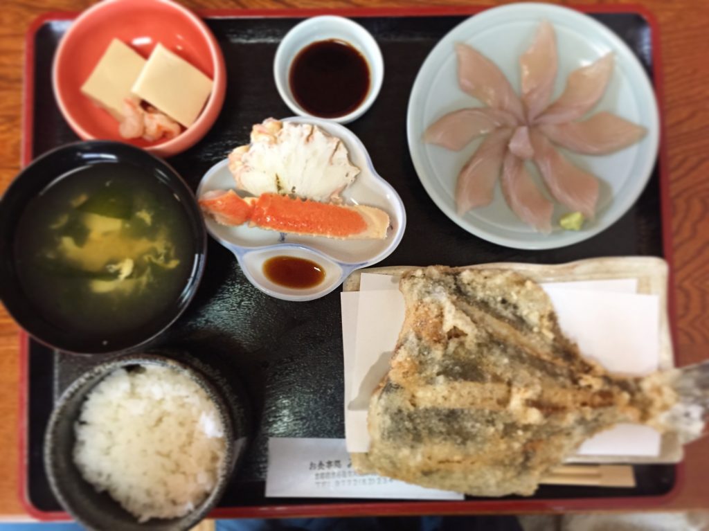 カレイの唐揚げ、お刺身、茹でがに、高野豆腐、ご飯、フグのお吸い物!