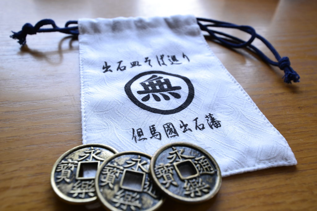 「永楽通宝」が3枚入っている出石皿そば巡り巾着セットを購入して、