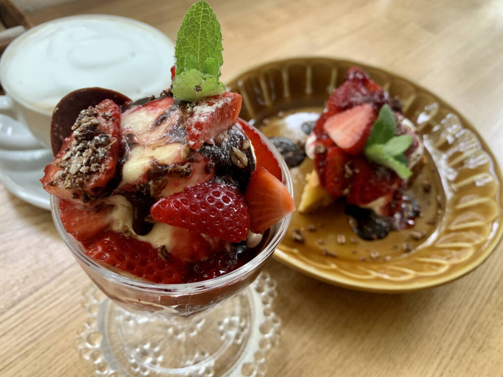 今回は、いちごシフォンパフェといちごのアーモンドタルトをいただきました🤤食いしん坊は、大のカフェラテ好きなので、セットで頼みました(笑)もこもこの雲みたいな泡がカフェラテにのってましたよ〜