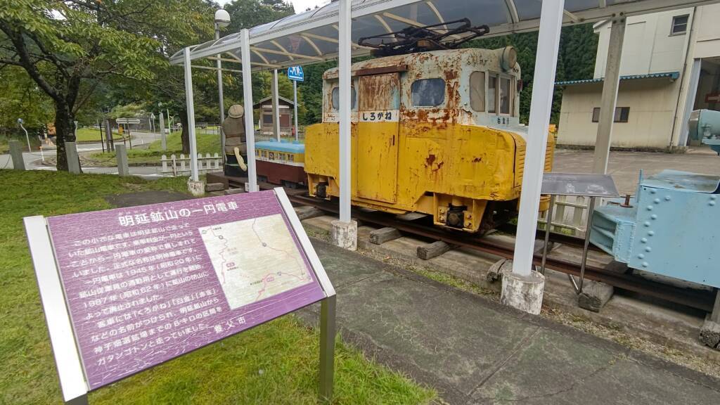 平成22年に、、一円電車が復活!!明延振興館前に長さ70mに渡る線路を敷き、客車くろがね号が運航されています。この客車くろがね号は、明延鉱山で最後まで使われた本物の一円電車なんですよ!