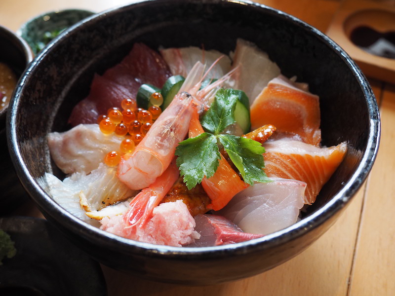 海鮮丼セット、かなりのボリュームです!下のご飯が見えないくらいネタがのっています!