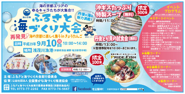 | お問い合せ | ふるさと海づくり大会実行委員会事務局(京都府漁協内) TEL 0773-77-2202 |