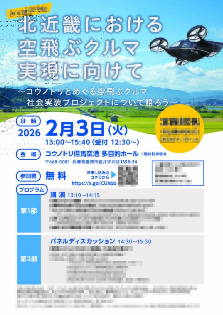 2026年2月3日(火)、兵庫県豊岡市の「コウノトリ但馬空港 多目的ホール」にて、「北近畿における空飛ぶクルマ 実現に向けて」と題したシンポジウムが開催されます。