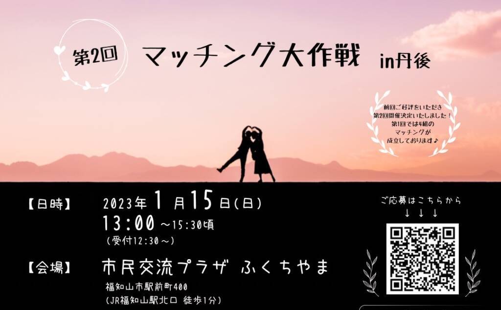 今回で第2回となるマッチング大作戦は、北近畿の25歳から35歳の男女の方を中心に、出会いの機会を増やしていただきたいと思い開催しております。