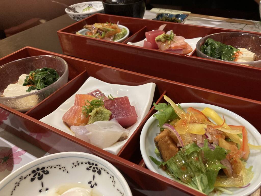 お刺身、マリネ、湯葉、温泉卵などお昼から贅沢〜😍